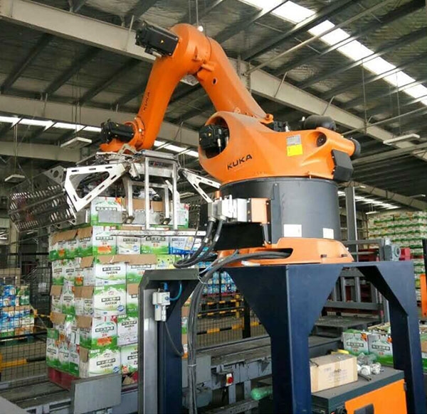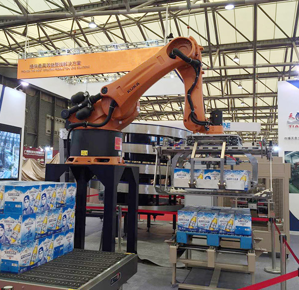 卸垛机是将整垛排列在托盘上纸箱,逐层分解在输送平台上,进行自动分箱, 连接割箱生产线直接上线。本设备采用PLC+触摸屏控制,实现智能化操作管理,简便、易掌握。可大大地减少劳动人员和降低劳动强度。采用高速、平稳、节省空间之理念设计。采用叠加式收集托盘、更快速、更节省空间。一机多用,调整迅速,不必为更换产品规格而烦恼。适用范围:瓦楞纸箱、塑胶箱、桶状包装物。 机械手卸垛采用德国库卡伺服运动控制系统和输垛定位及分箱输送构成,操作简单方便,低能耗等优点在自动化生产线得到广泛使用。 卸垛机抓手设计张开尺寸为:1260mm×1260mm; 可适应垛板尺寸:1100mm×1100mm×150mm; 物体最大尺寸为:1160mm×1160mm×高2000mm 如有其它尺寸的请在订机前说明。 自动纸箱瓶卸垛机包括:垛板输送带、垛板仓、机械手及夹具、卸垛平台、储箱平台、分箱平台、理箱输送、提速输送、转向输送、安全防护装置、 整线控制系统。 |